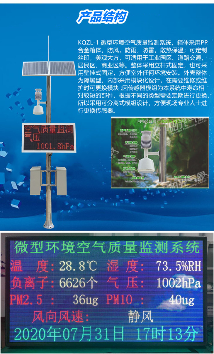 KQZL-1 微型環(huán)境空氣質(zhì)量監(jiān)測(cè)系統(tǒng),箱體采用PP合金箱體,防風(fēng),防雨,防雷,散熱保溫;可定制絲印,美觀大方,可適用于工業(yè)園區(qū)、道路交通,居民區(qū),商業(yè)區(qū)等。整體采用立桿式固定,也可采用壁掛式固定,方便室外任何環(huán)境安裝。外殼整體為隔爆型,內(nèi)部采用模塊化設(shè)計(jì),在需要維修或維護(hù)時(shí)可更換模塊 ;因傳感器模組為本系統(tǒng)中壽命相對(duì)較短的部件,根據(jù)不同的類型需要定期進(jìn)行更換,所以采用可分離式模組設(shè)計(jì),方便現(xiàn)場(chǎng)專業(yè)人士進(jìn)行更換傳感器。