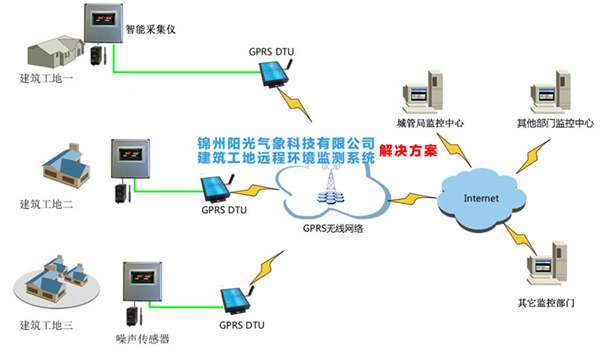 客戶需要在八個施工點實現(xiàn)遠(yuǎn)程的噪聲、粉塵參數(shù)的監(jiān)測預(yù)警,然后通過終端傳輸設(shè)備接入到Internet網(wǎng)絡(luò)。共八個施工點需要同時監(jiān)測,全部接入到服務(wù)器機(jī)房,客戶端采用web網(wǎng)頁方式實施管理和查詢。達(dá)到實時監(jiān)控與指揮的目的。